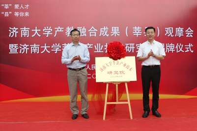 儀式上,濟南大學黨委副書記王玉華、莘縣縣委書記王峰共同為濟南大學莘縣產業技術研究院揭牌。