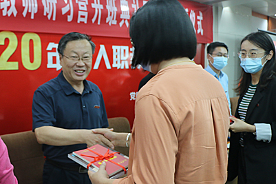 首先舉行新入職教師入職宣誓儀式。校長張士強,副校長王志和各部門負責人為新入職教師代表佩戴校徽并贈送書籍。在國旗前,由自動化與電氣工程學院王焱教授領(lǐng)誓,全體新入職教師高舉右手,面向國旗,莊嚴宣誓。隨后,新教師郭謙代表全體學員發(fā)言,表示將認真參加研習,努力成為合格的教師;王焱教授代表老教師對新入職教師表達了殷切期望和祝福。