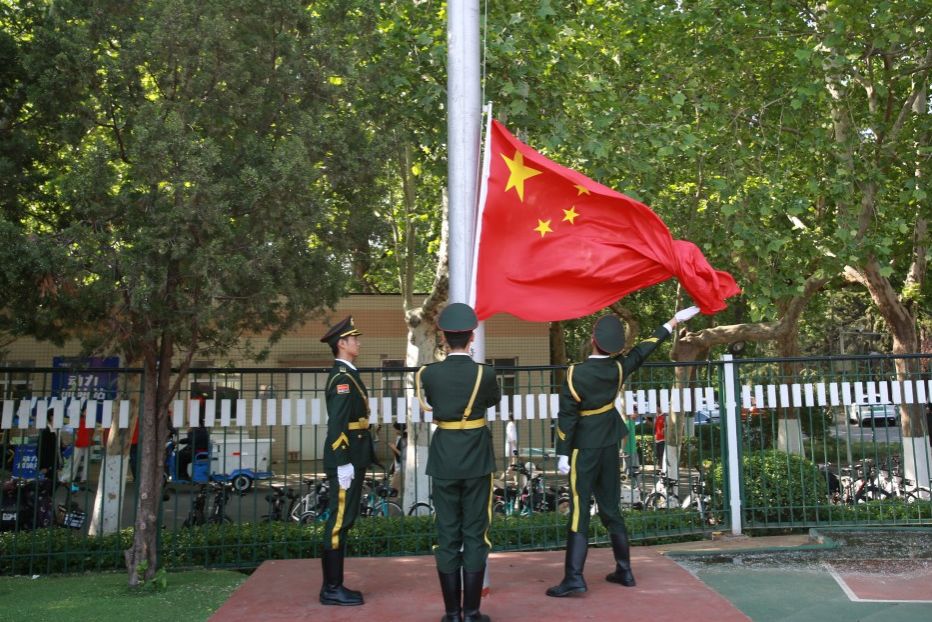 在雄壯的國歌聲中,鮮艷的五星紅旗在運動場上空升起。