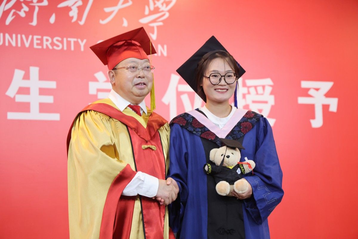 來自各學(xué)院的畢業(yè)生在師生和家長們的見證下,身著學(xué)士服、碩士服、博士服依次上臺。校長劉宗明為畢業(yè)生一一撥穗、合影留念并親切鼓勵。隨后,學(xué)院領(lǐng)導(dǎo)、教師和畢業(yè)生們一一握手,以表祝賀。