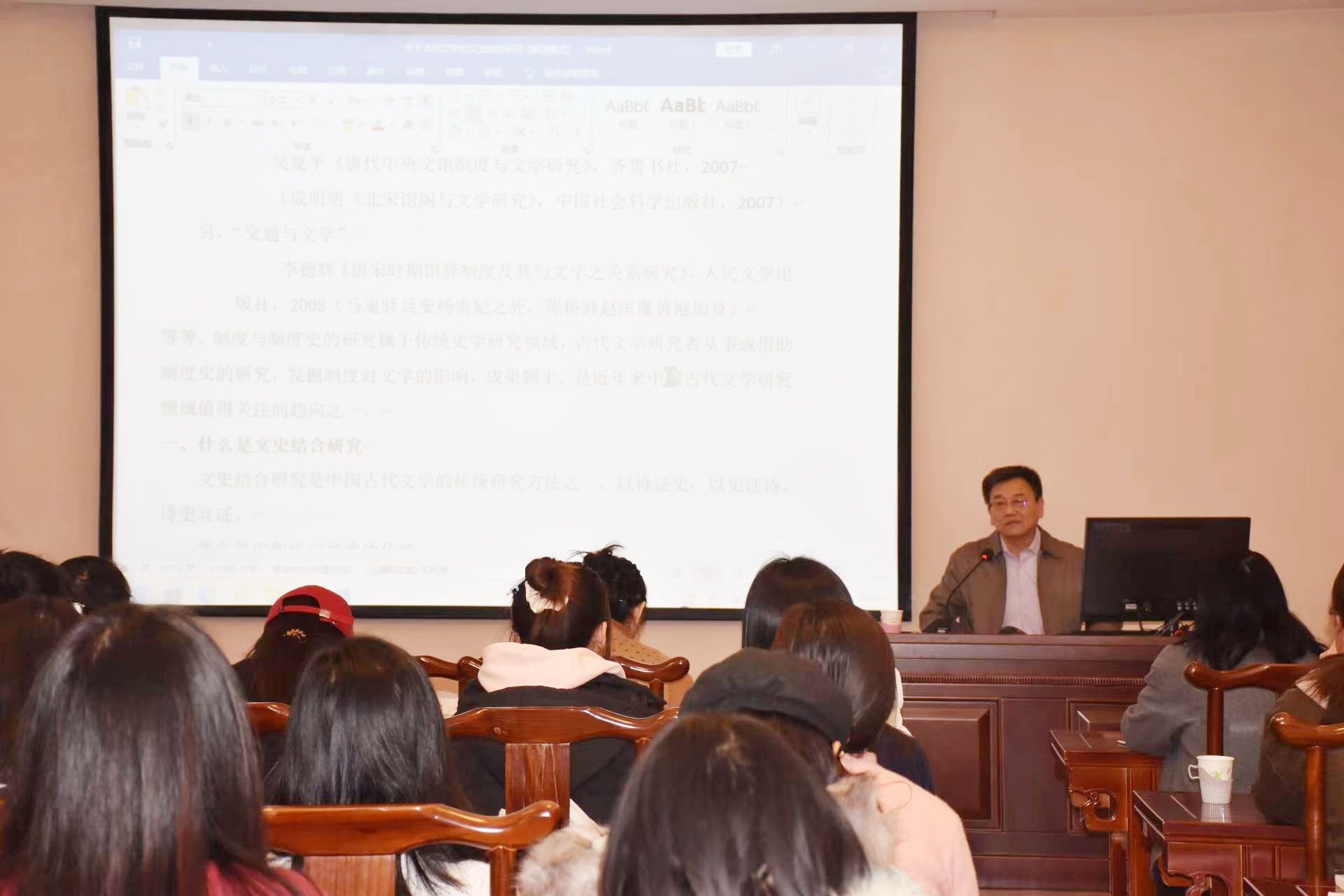 馬自力教授首先以古代文學的本體論入手,明確地指明了中國古代文學研究不可能是絕對意義上的純文學研究,而是一個跨領域的研究,尤其強調和歷史學科的交叉運用。緊接著馬自立教授以吳夏平的《唐代制度與文學研究述論稿》為例,說明了中國古代文學與史學交叉研究是當前學術界的前沿與熱點之一。在此基礎上,馬教授結合自身的科研經歷進一步為大家講解了什么是文史結合研究、文史結合研究發展的階段性、為什么要進行制度與文學關系的研究、怎樣進行制度與文學關系的研究、處理文史關系應把握的原則和避免的誤區等方面。鼓勵大家關注古代文學與歷史學科的交叉,開闊視野、努力創新。