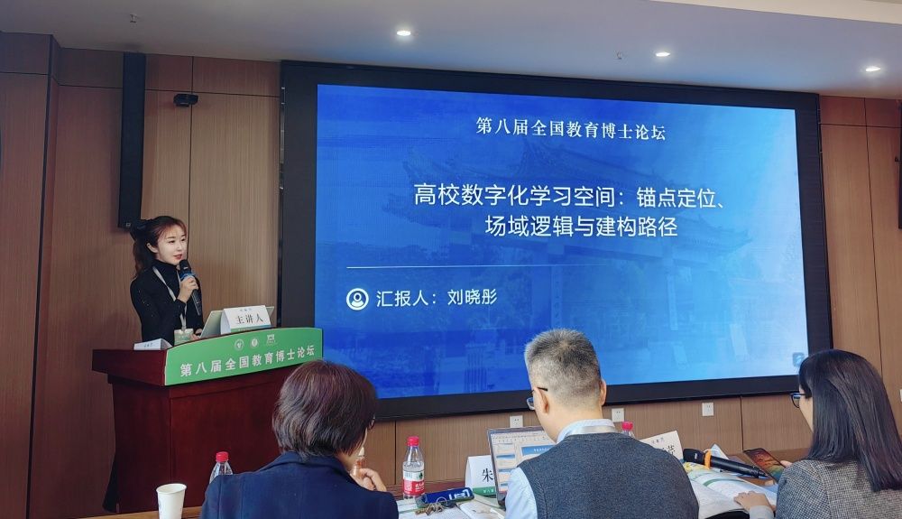 我校教育與心理科學學院劉曉彤老師受邀參加論壇,并作了“高校數字化學習空間:錨點定位、場域邏輯與建構路徑”主題報告。她指出,隨著新一代數字技術不斷滲透到教育領域,以數字化轉型促進人類知識從“原子賦型”向“比特傳播”轉變、以數字化生存驅動人類學習從“棲居紙本”向“悠游網絡”嬗變已經成為時代命題的中心。在此背景上,她積極探索了未來高校數字化學習空間的特質定位與場域形態,為“身體缺場”的大學生找到集體想象的認同場所。這一空間具有分布式跨區域協作、具身沉浸高保真體驗、虛實共生數據驅動的學習活動特征,進而演變成數字技術重構物質空間的“分布式發生場”、現實情景融合虛擬空間的“具身式意義場”和虛實共生融入泛在空間的“交互式生活場”。同時,她基于情境創設、超域協同知識建構、反思評價三個學習階段重構了空間新樣態下的數字化探究學習模式,試圖為數字技術的學習應用提供具有可操作性的實踐范式,為高等教育數字化轉型贏得更多時空能動性。