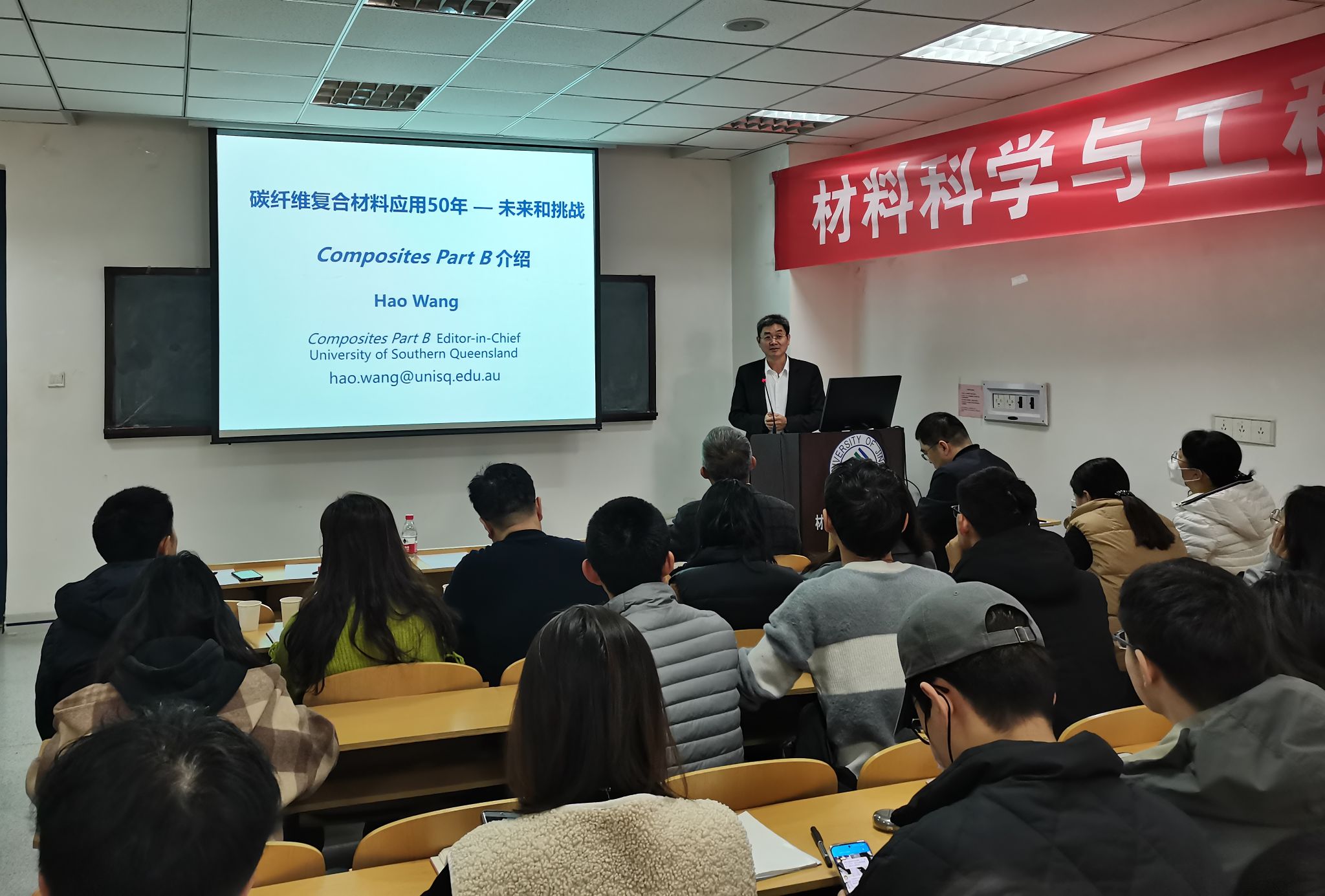 12月6日上午,澳大利亞南昆士蘭大學教授、復合材料頂刊Composites Part B: Engineering雜志主編(IF=13.1)王浩教授應邀來山東省建筑材料制備與測試技術重點實驗室和材料學院作了題為《碳纖維復合材料應用50年 - 未來展望及挑戰》及《Composites Part B 期刊介紹和SCI文章寫作》的學術報告。報告由泰山學者攀登計劃專家程新教授主持,山東省建筑材料制備與測試技術重點實驗室、材料學院相關專業師生百余人參與此次活動。