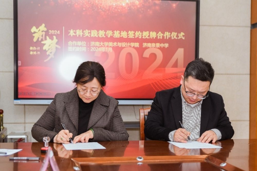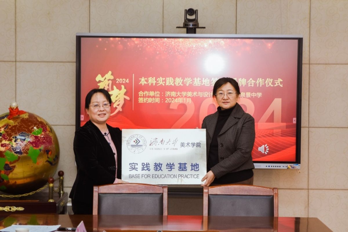 1月9日,濟南大學美術與設計學院與濟南泉景中學開展本科實踐教學基地授牌、簽約合作儀式,共同拉開兩校全面合作的序幕。濟南泉景中學校長馮曉青、副校長魏靖、主任李艷美和泉景中學和小學部美術組全體教師,濟南大學教務處副處長兼師范教育管理辦公室主任張婷、美術與設計學院相關負責人、美術系負責人共同參加簽約儀式。