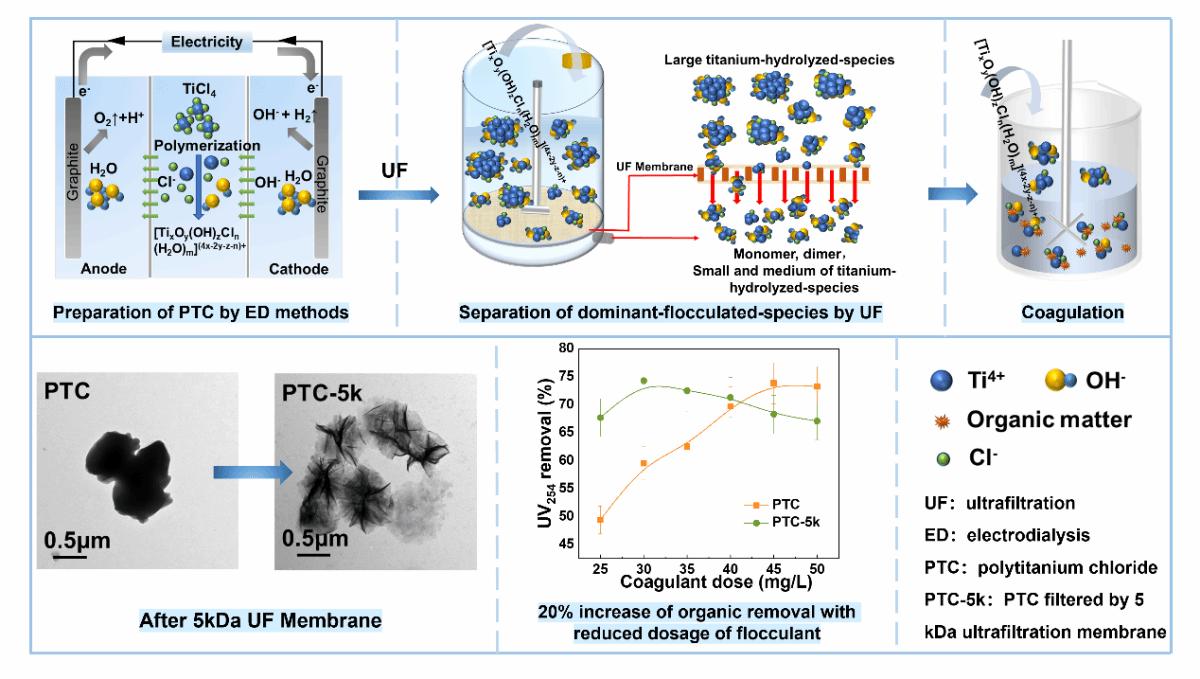 優勢絮凝物種的豐度是決定混凝劑混凝性能的關鍵。鈦基混凝劑因其混凝效率高而備受關注,但如何鑒定并分離主要絮凝物種是目前面臨的一個挑戰。先前我們課題組通過精確的控制鈦水解物種與OH- 之間的微界面反應,利用電滲析法(ED)成功合成了富含優勢絮凝物種的聚合氯化鈦(PTC)。