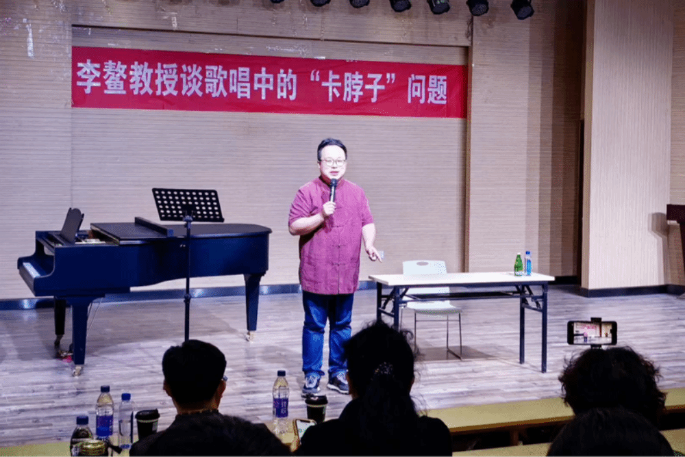 李鰲以幽默風趣、循循善誘的方式開講,他首先闡明了什么是歌唱中的“卡脖子”問題,繼而從發聲理念、歌唱技術、作品風格、發音吐字、審美認知、歌詞意境、舞臺實踐等方面逐一答疑釋惑,為全體與會者生動講解了演唱技術、聲樂學習方法及歌唱的審美問題。
