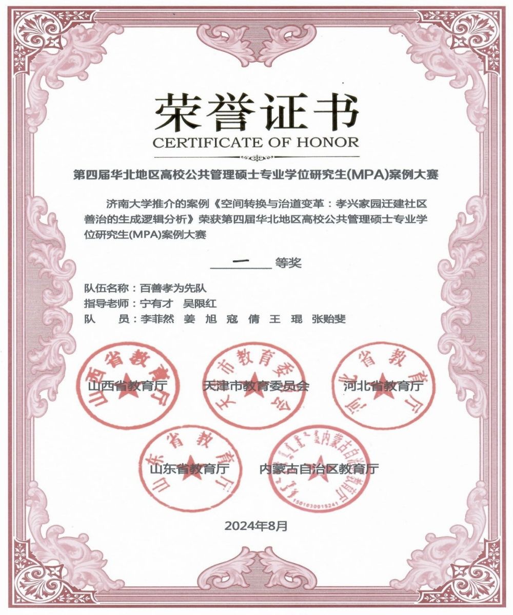 本次大賽共有來自山西、天津、山東、河北、內(nèi)蒙古五個(gè)省(市、自治區(qū))高等院校的六十支隊(duì)伍參加。由我校政法學(xué)院教師寧有才、吳限紅指導(dǎo),公共管理學(xué)2023級(jí)研究生李菲然(隊(duì)長(zhǎng))、公共管理(MPA)2022級(jí)研究生姜旭、王琨、寇倩、張貽斐組成的“百善孝為先”隊(duì)代表濟(jì)南大學(xué)參賽,并提交參賽案例《空間轉(zhuǎn)換與治道變革:孝興家園遷建社區(qū)善治的生成邏輯分析》。