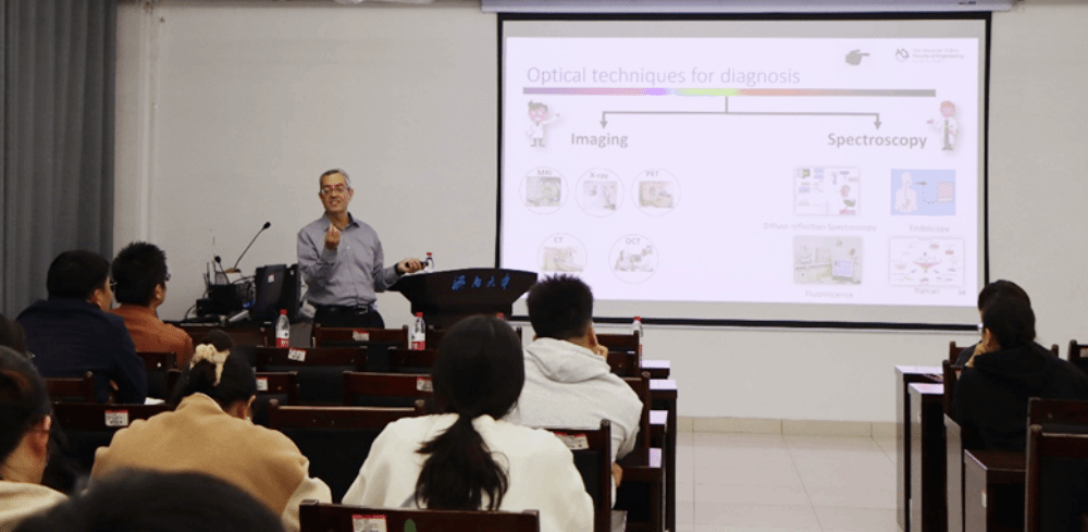 Dror Fixler教授以“納米光子學及其生物應用”為題做了精彩的學術報告。他闡述了用納米光子學工具重建參與介質光學性質的理論和實踐模型,介紹了Dror Fixler實驗室使用擴散反射剖面、添加納米顆粒作為對比劑、全散射剖面及其等徑長點或迭代相位多次測量重建技術來探測組織特性,利用熒光壽命和熒光各向異性等光學參數的變化來探測多種生物環境,講解了金納米顆粒(球體和棒狀)、有機納米顆粒以及類組織體模等化學和生物材料的設計制備,以及在癌癥和動脈硬化等疾病診斷、不同生理參數、可視化酶活性和早期細胞突變檢測等各方面的應用。報告深入淺出,使師生們獲益良多。報告會后,Fixler教授與參會師生進行了深入交流,并耐心解答了大家的提問。