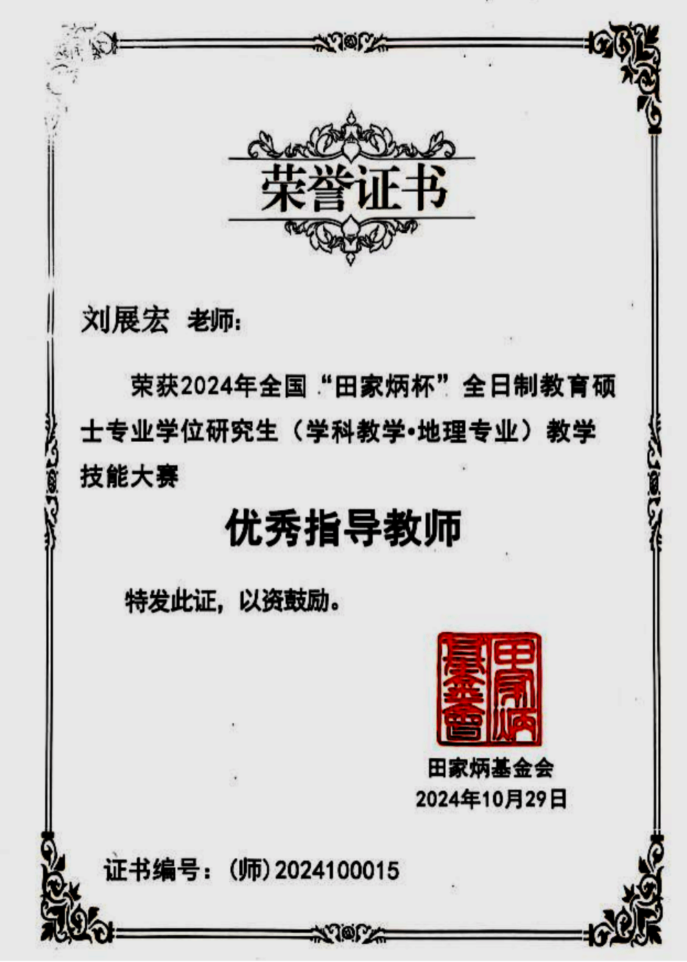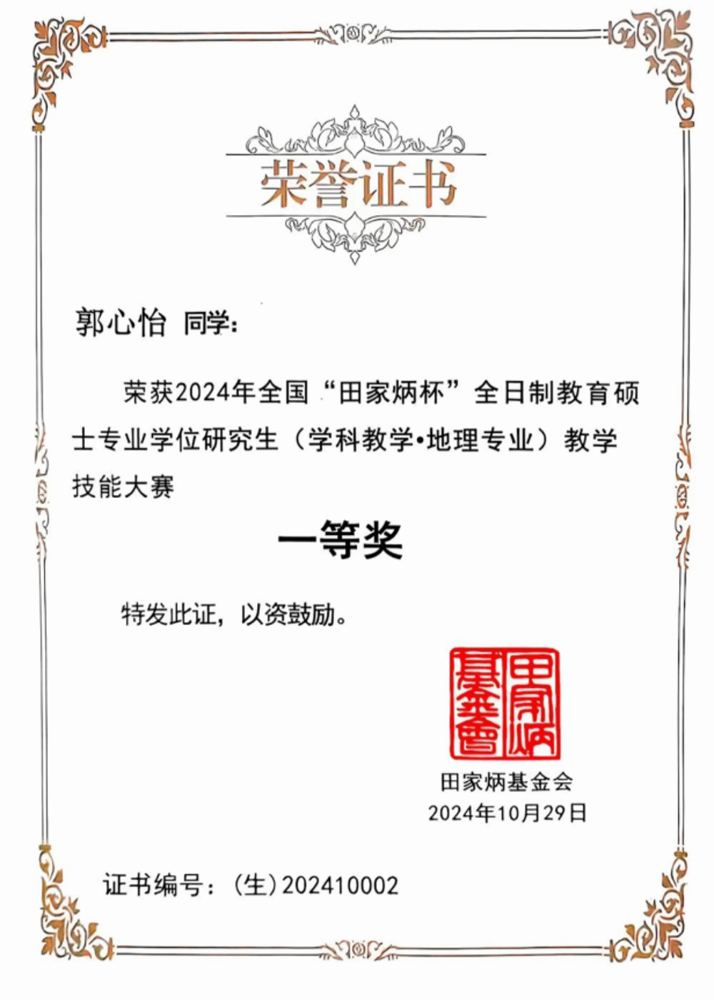 近日,由全國教育專業學位研究生教育指導委員會主辦、田家炳基金會冠名的2024年全國“田家炳杯”全日制教育碩士專業學位研究生學科教學(地理)專業教學技能大賽決賽在西南大學落下帷幕。經過激烈角逐,水利與環境學院2023級學科教學(地理)專業研究生郭心怡榮獲全國一等獎,劉展宏教師獲“優秀指導教師”獎。