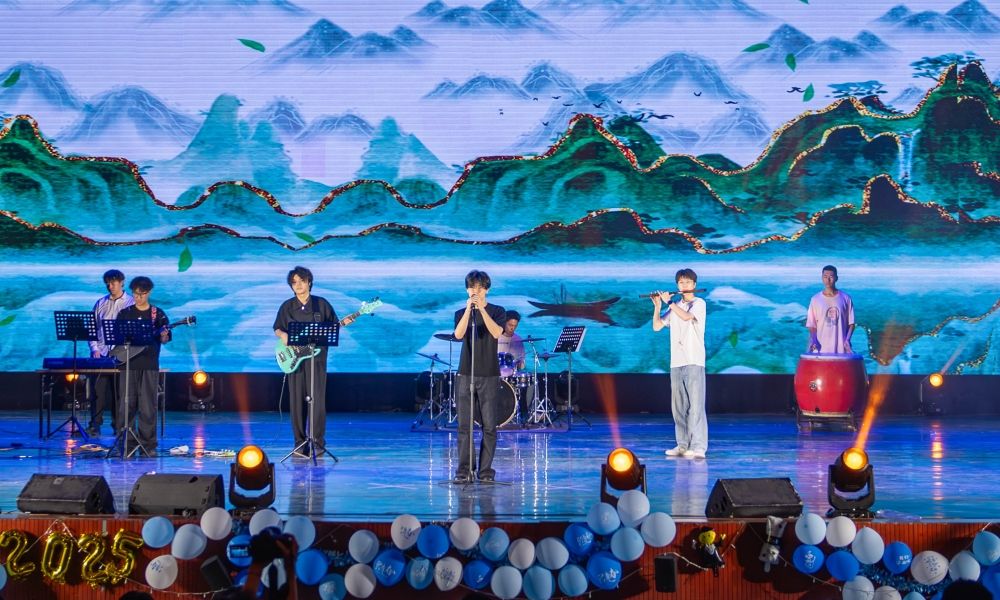 晚會在樂隊表演的《不說再見》和《閃耀》中拉開序幕,激昂的旋律里,唱出了畢業生們對校園的眷戀與未來的憧憬。隨后,學院李童童老師帶來大氣磅礴的獨唱《和諧中國》,用歌聲傳遞家國情懷,以優美旋律唱響時代華章。當《平凡之路》《你曾是少年》《鳳凰花開的路口》這些熟悉的旋律響起,臺下觀眾自發點亮手機閃光燈,化作星海隨節拍輕輕搖曳,全場沉浸在這場關于青春、成長與告別的集體回憶中。活力四射的舞蹈串燒《Funk Alarm》和《One Spark》中,2023級輔導員鄭威老師與Only Crew舞社的同學們以極具感染力的舞姿,完美演繹了青春的蓬勃朝氣與無限可能。在莊重激昂的朗誦節目《廉潔頌》中,用擲地有聲的語調、飽滿真摯的情感,為青春年華注入清正廉潔的責任底色。燈影戲《我們的四年青春》以其獨特的藝術形式成為最動人的“情感催化劑”,通過光影的魔力將大學四年的成長蛻變、青春追憶與離別愁緒娓娓道來,引發全場共鳴。畢業生們自己作詞改編的歌曲《二環南路的日子》,以飽含深情的歌詞和旋律,為全場帶來了一場對“濟大”的青春告白,讓四年的歡笑與淚水都在歌聲中得到了最完美的詮釋。在晚會的尾聲,一曲精心編排的歌曲串燒《光陰的故事》與《明天會更好》將現場氣氛推向高潮,當熟悉的旋律響起,臺上臺下共同哼唱,共同譜寫畢業季最動人的青春樂章。