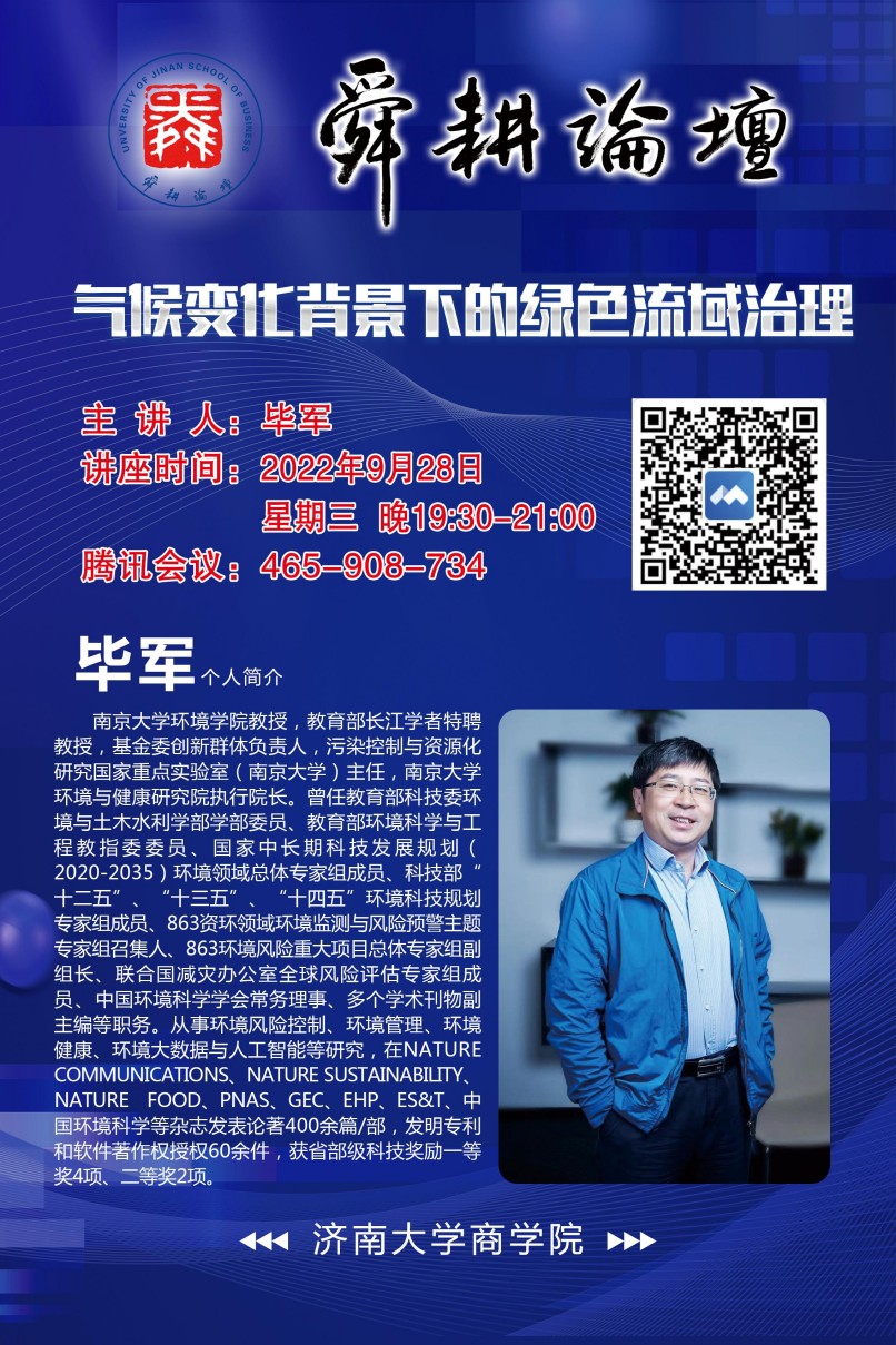 舜耕論壇本期邀請南京大學畢軍教授講座,主題是:氣候變化背景下的綠色流域治理。